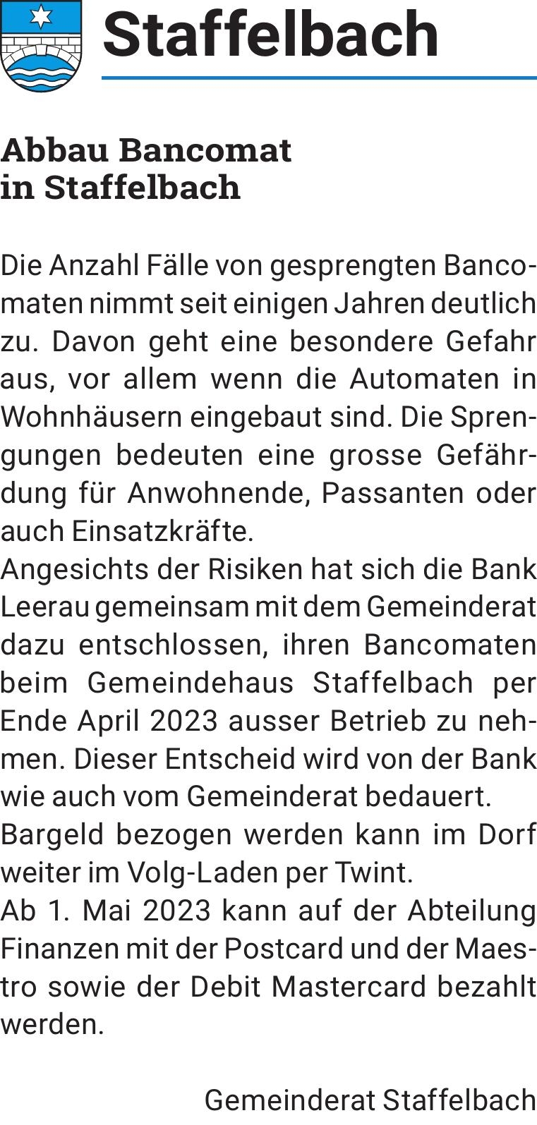 Sie sind hier: Home > Amtliche Mitteilungen > Abbau Bancomat in Staffelbach