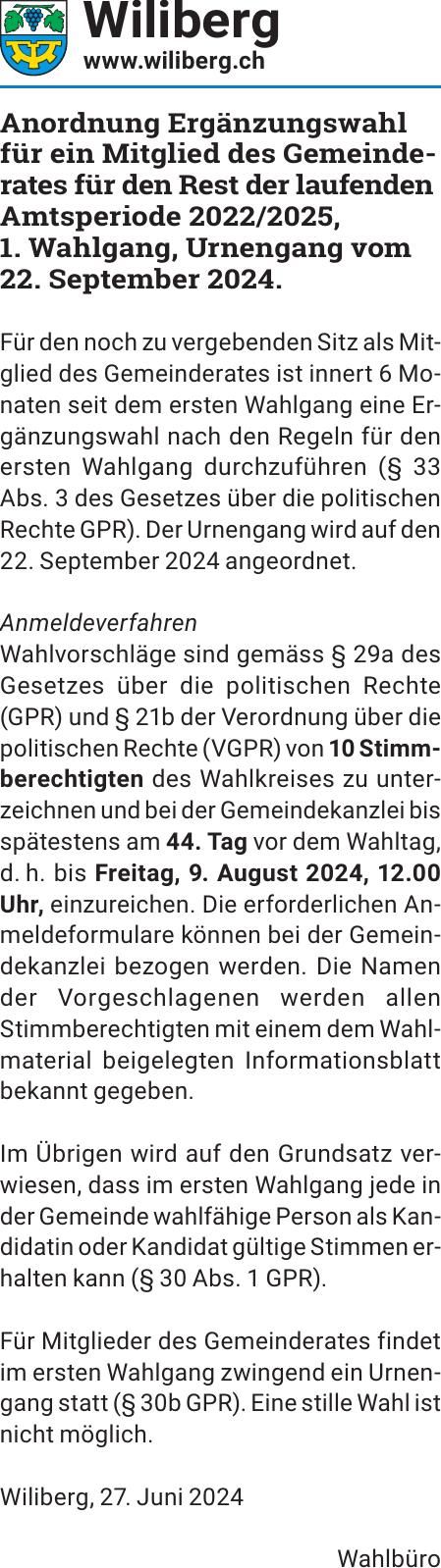 Anordnung Ergänzungswahl für ein Mitglied des Gemeinderates fu