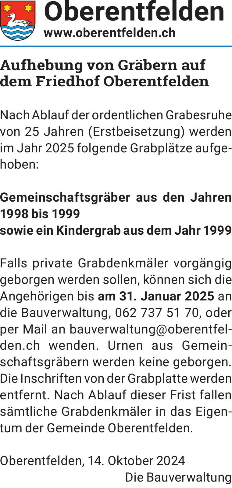 Aufhebung von Gräbern auf dem Friedhof Oberentfelden