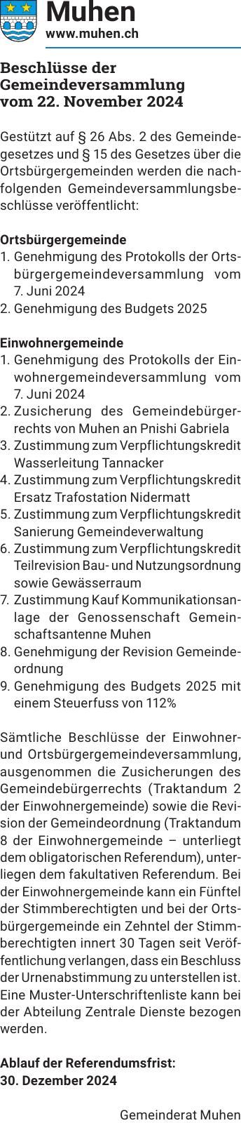 Beschlüsse der Gemeindeversammlung vom 22. November 2024