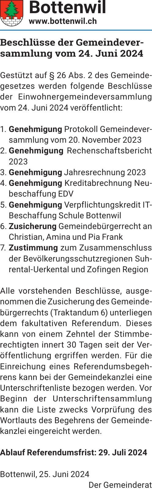 Sie sind hier: Home > Amtliche Mitteilungen > Beschlüsse der Gemeindeversammlung vom 24. Juni 2024
