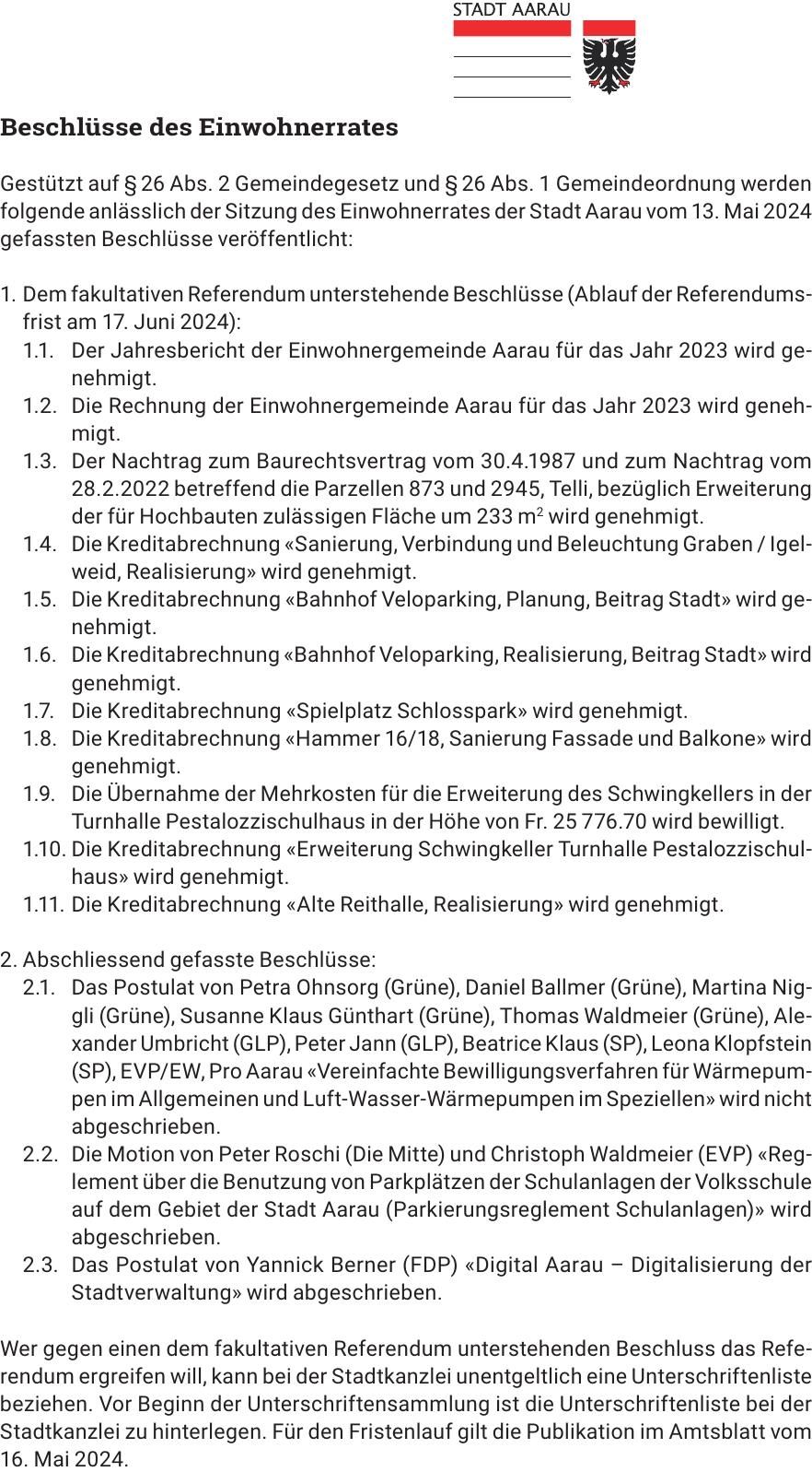 Sie sind hier: Home > Amtliche Mitteilungen > Beschlüsse des Einwohnerrates
