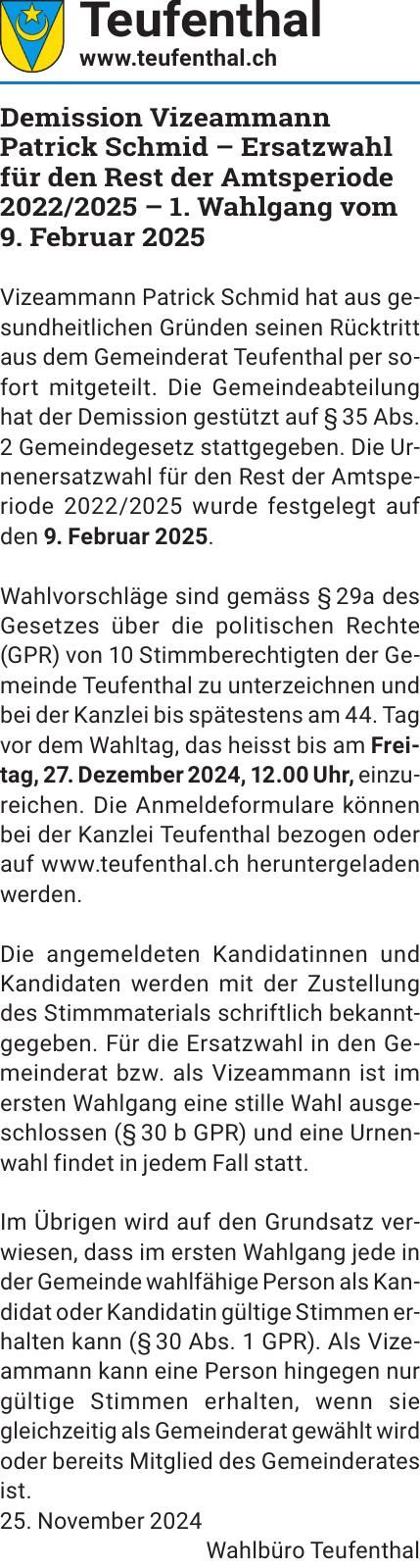 Demission Vizeammann Patrick Schmid – Ersatzwahl für den Rest