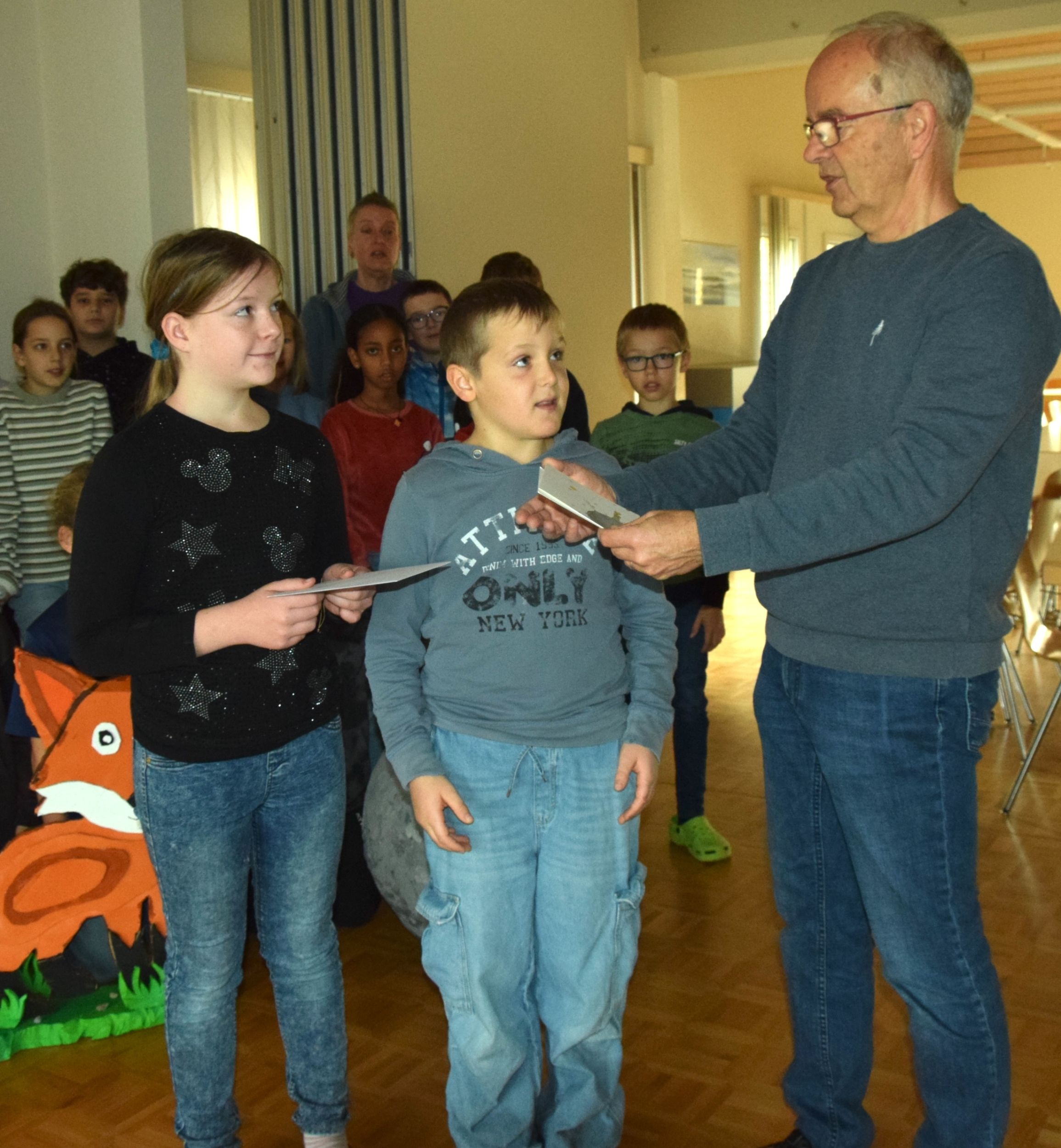 Celine (5. Kl.) und Joas (4. Kl.): Kuno Matter überreichte der Vertretung ihrer Klasse das geheimnisvolle Couvert.