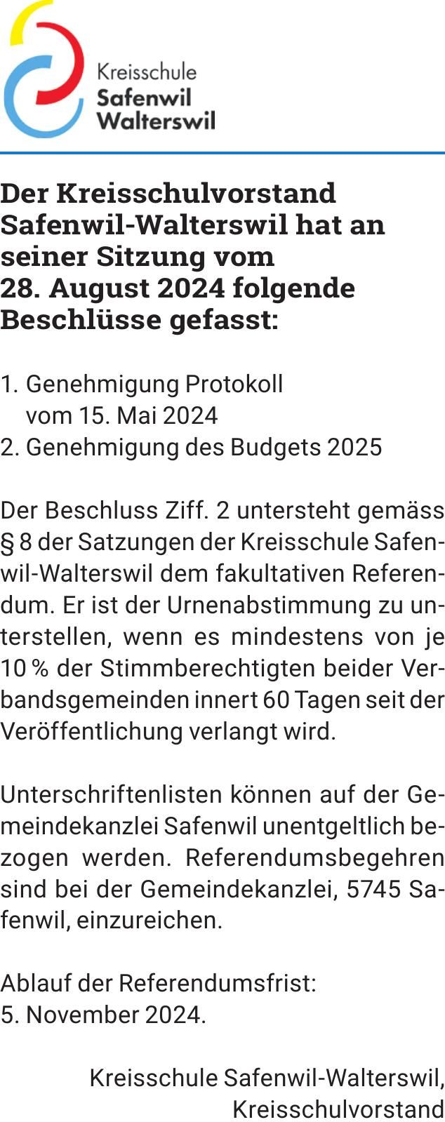Der Kreisschulvorstand Safenwil-Walterswil hat an seiner Sitzun
