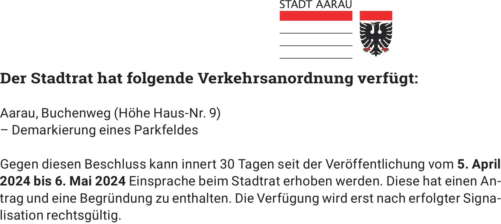 Der Stadtrat hat folgende Verkehrsanordnung verfügt