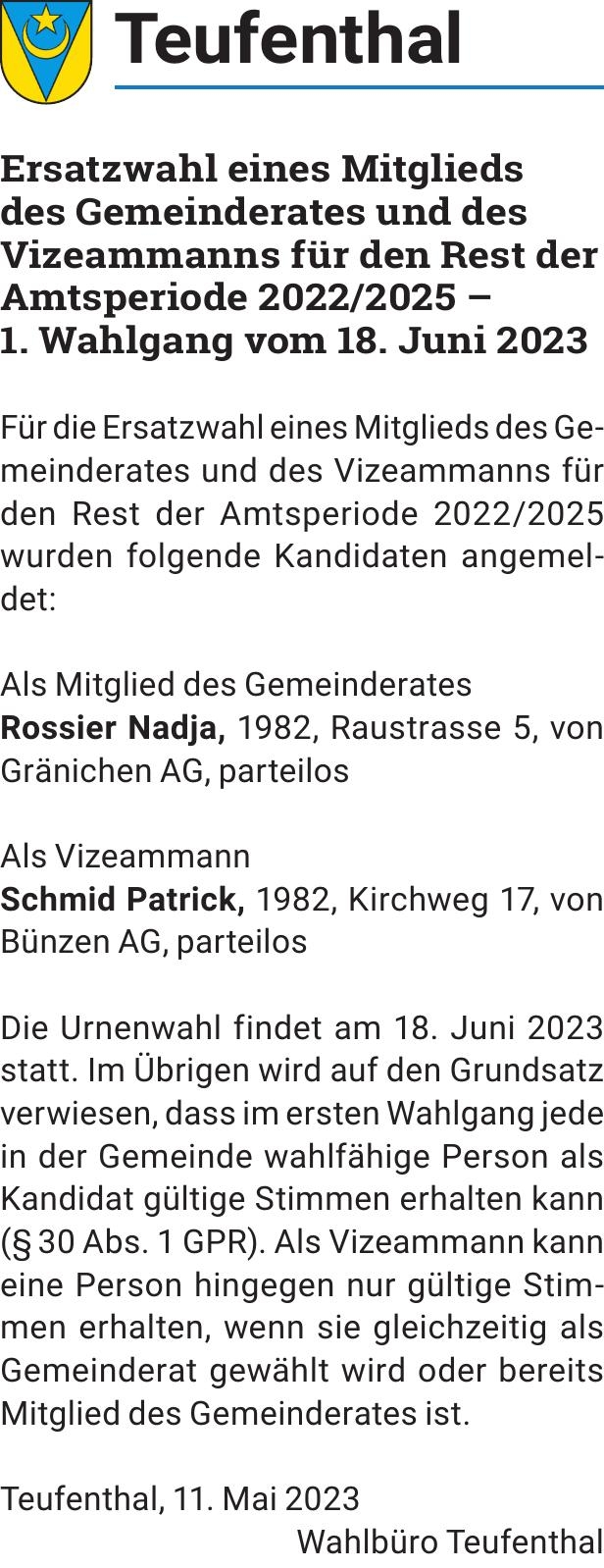 Sie sind hier: Home > Amtliche Mitteilungen > Ersatzwahl eines Mitglieds des Gemeinderates und des Vizeammann