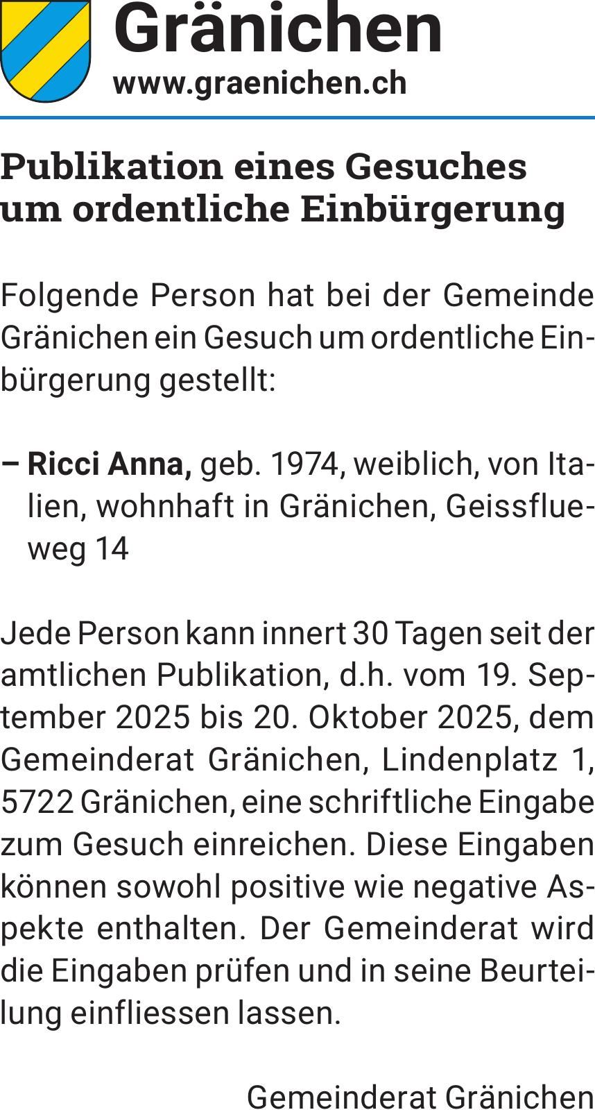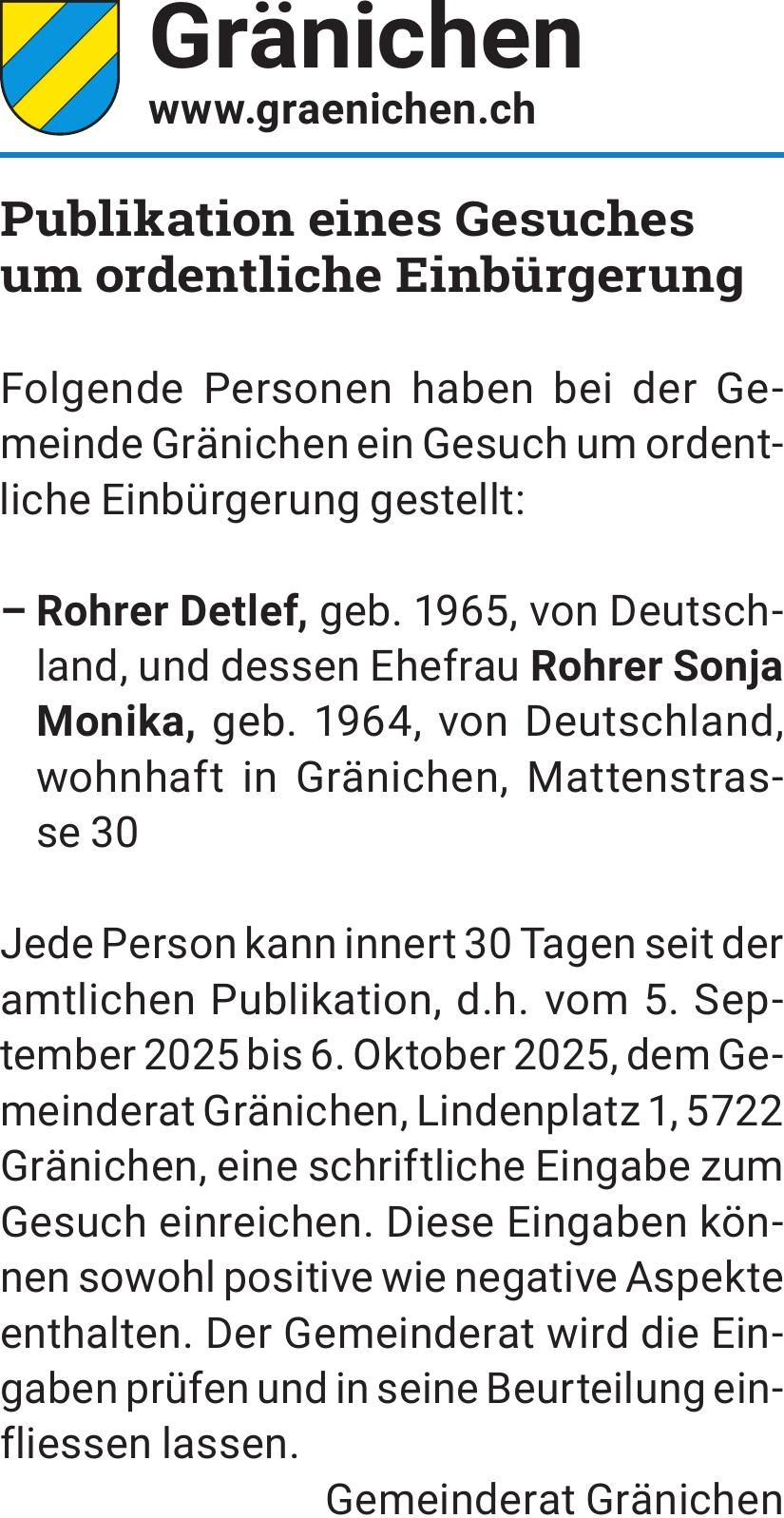 Publikation eines Gesuches um ordentliche Einbürgerung