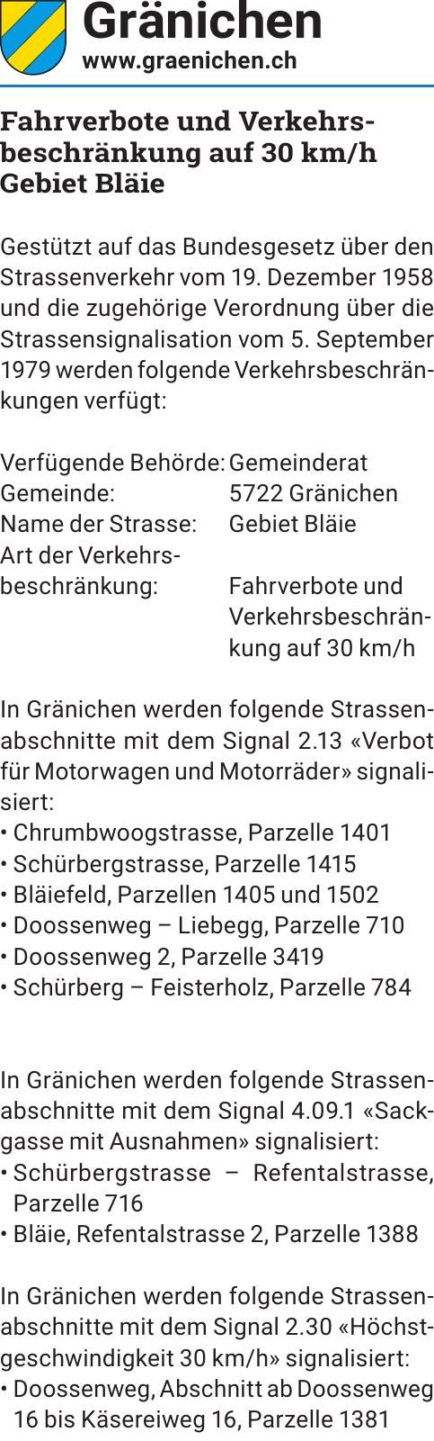 Fahrverbote und Verkehrsbeschränkung auf 30 km h Gebiet Bläie