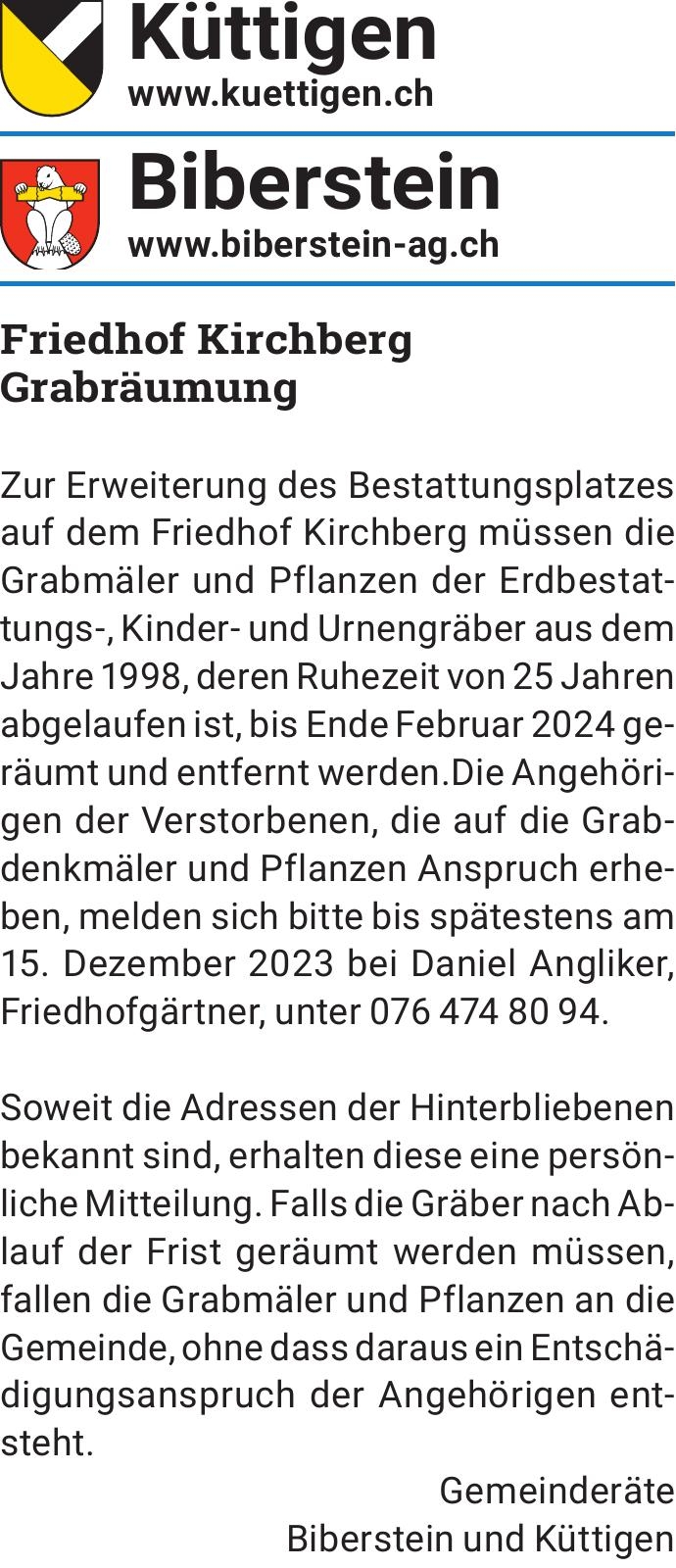 Zur Erweiterung des Bestattungsplatzes auf dem Friedhof Kirchberg müssen die Grabmäler und Pflanzen der Erdbestattungs-, Kinder- und Urnengräber aus den Jahren 1995 und 1996, deren Ruhezeit von25Jahrenabgelaufen ist, bis Ende Februar 2022geräumt und entfernt werden.