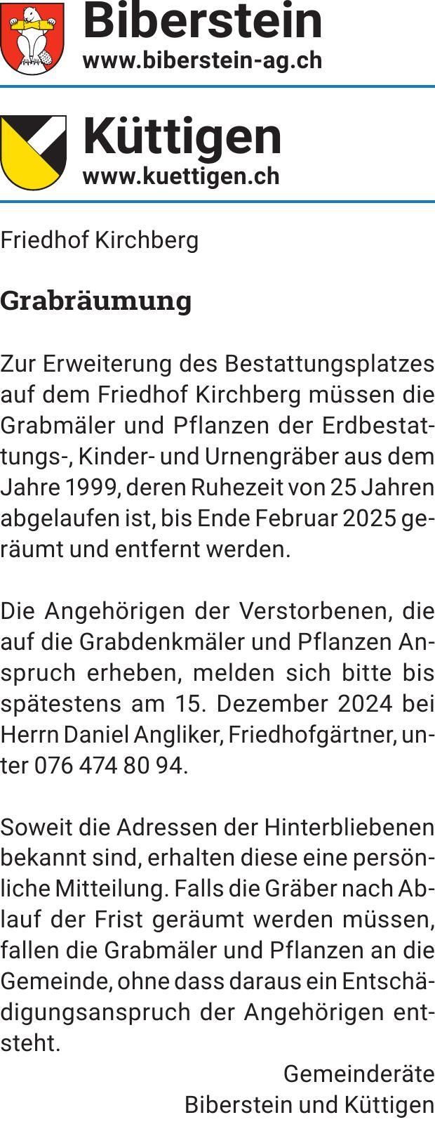 Die Angehörigen der Verstorbenen, die auf die Grabdenkmäler und Pflanzen Anspruch erheben, melden sich bitte bis spätestens am 16. Dezember 2022 bei Herrn Kari Deiss, Leiter Werkhof, Telefon 079 475 45 64.