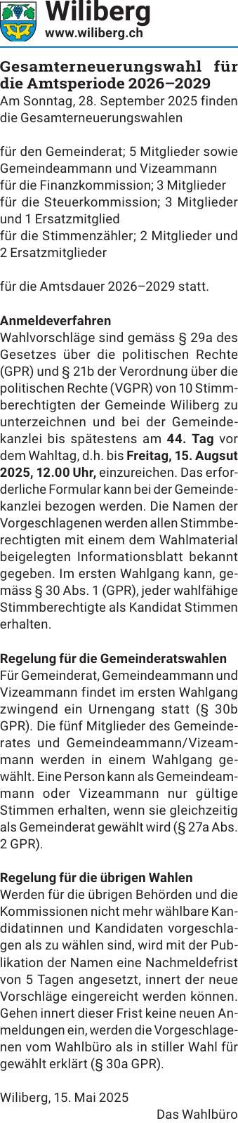 Gesamterneuerungswahl für die Amtsperiode 2026–2029