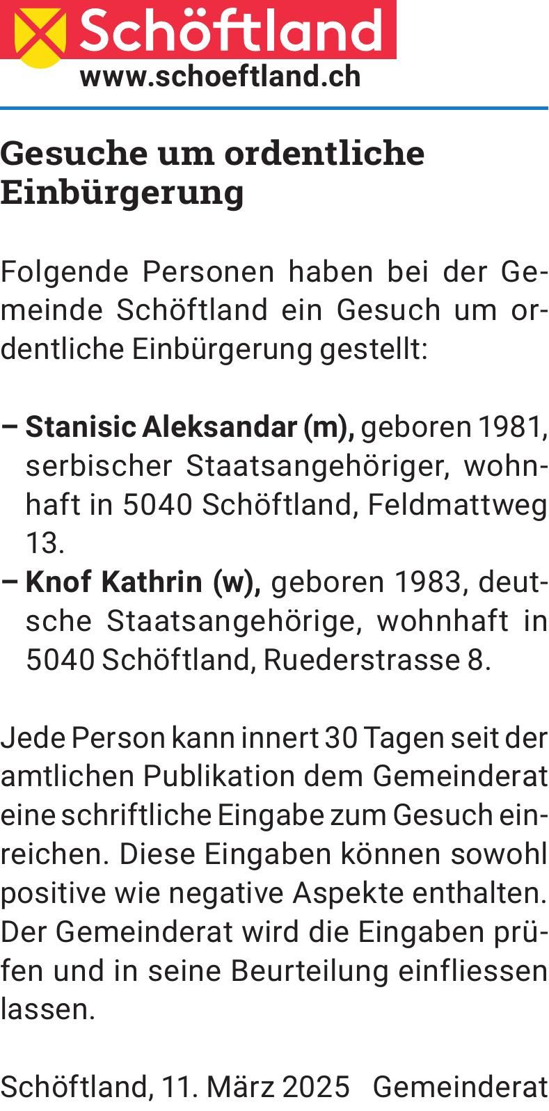 Sie sind hier: Home > Amtliche Mitteilungen > Gesuche um ordentliche Einbürgerung