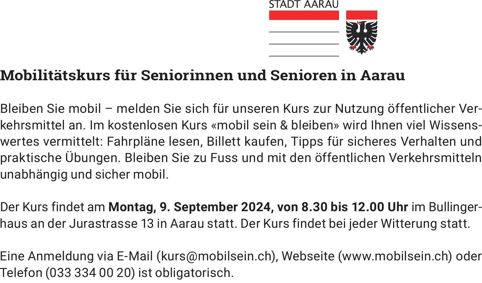 Sie sind hier: Home > Amtliche Mitteilungen > Mobilitätskurs für Seniorinnen und Senioren in Aarau