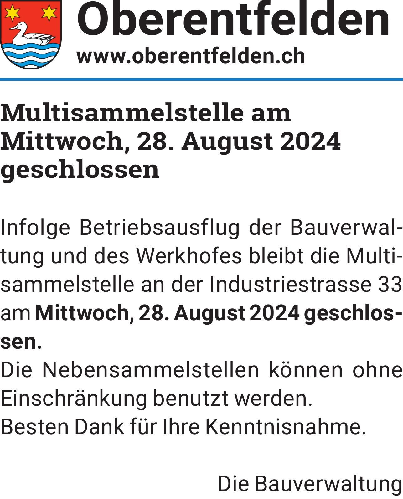 Multisammelstelle am Mittwoch, 28. August 2024 geschlossen