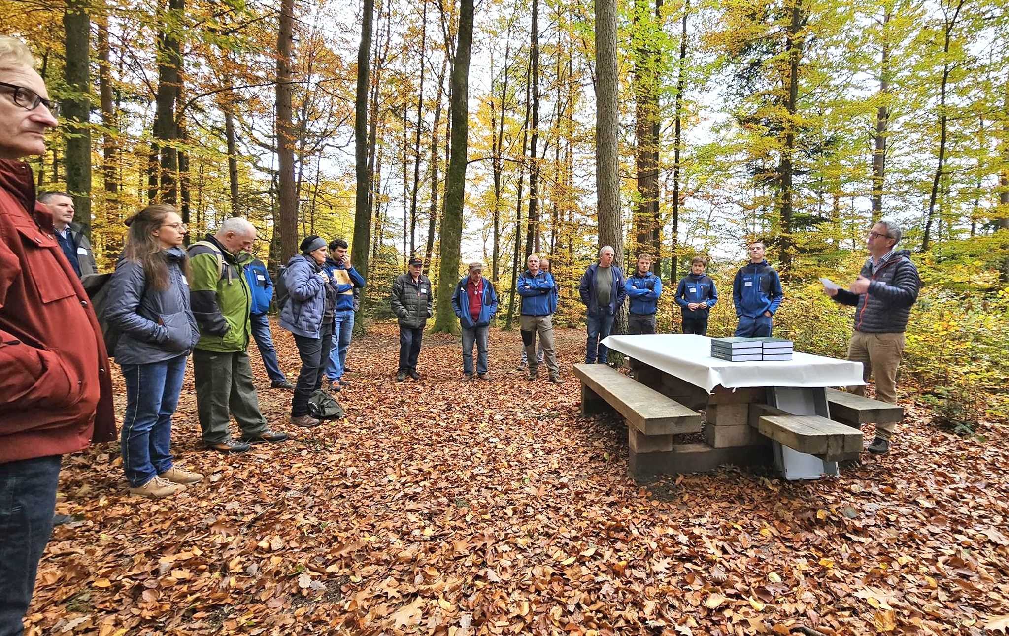 Mitten im herbstlichen Roggenhausenwald wurde am Mittwochnachmittag, 29. Oktober, der neue Betriebsplan 2026–2040 des Forstbetriebs Region Aarau feierlich unterzeichnet. Stadtpräsident Dr. Hanspeter Hilfiker und Stadtförster Roger Wirz begrüssten die Anwesenden, bevor bei einem Rundgang durch den Wald die wichtigsten Eckpunkte des umfassenden Werkes vorgestellt wurden.