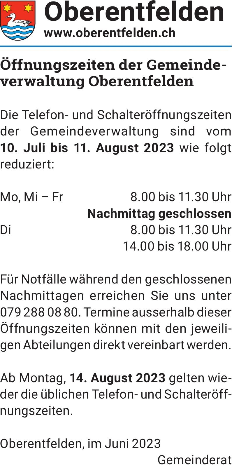 Öffnungszeiten der Gemeindeverwaltung Oberentfelden