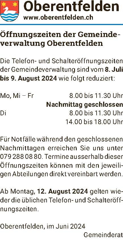 Sie sind hier: Home > Amtliche Mitteilungen > Öffnungszeiten der Gemeindeverwaltung Oberentfelden