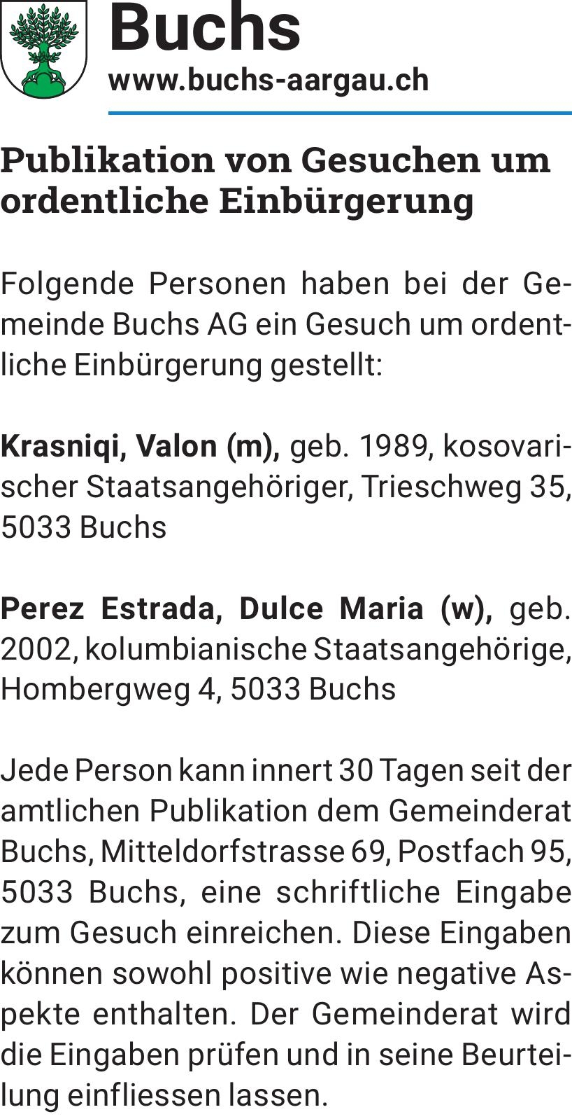Publikation von Gesuchen um ordentliche Einbürgerung