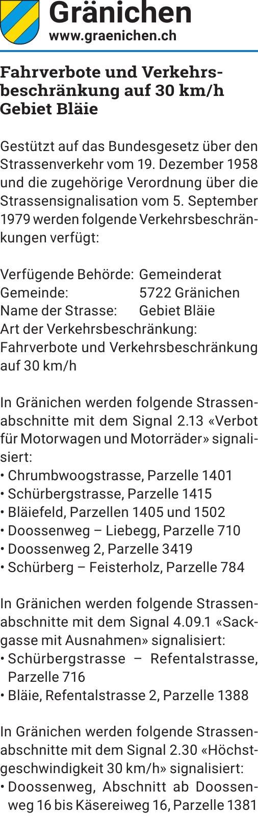 Fahrverbote und Verkehrsbeschränkung auf 30 km h Gebiet Bläie