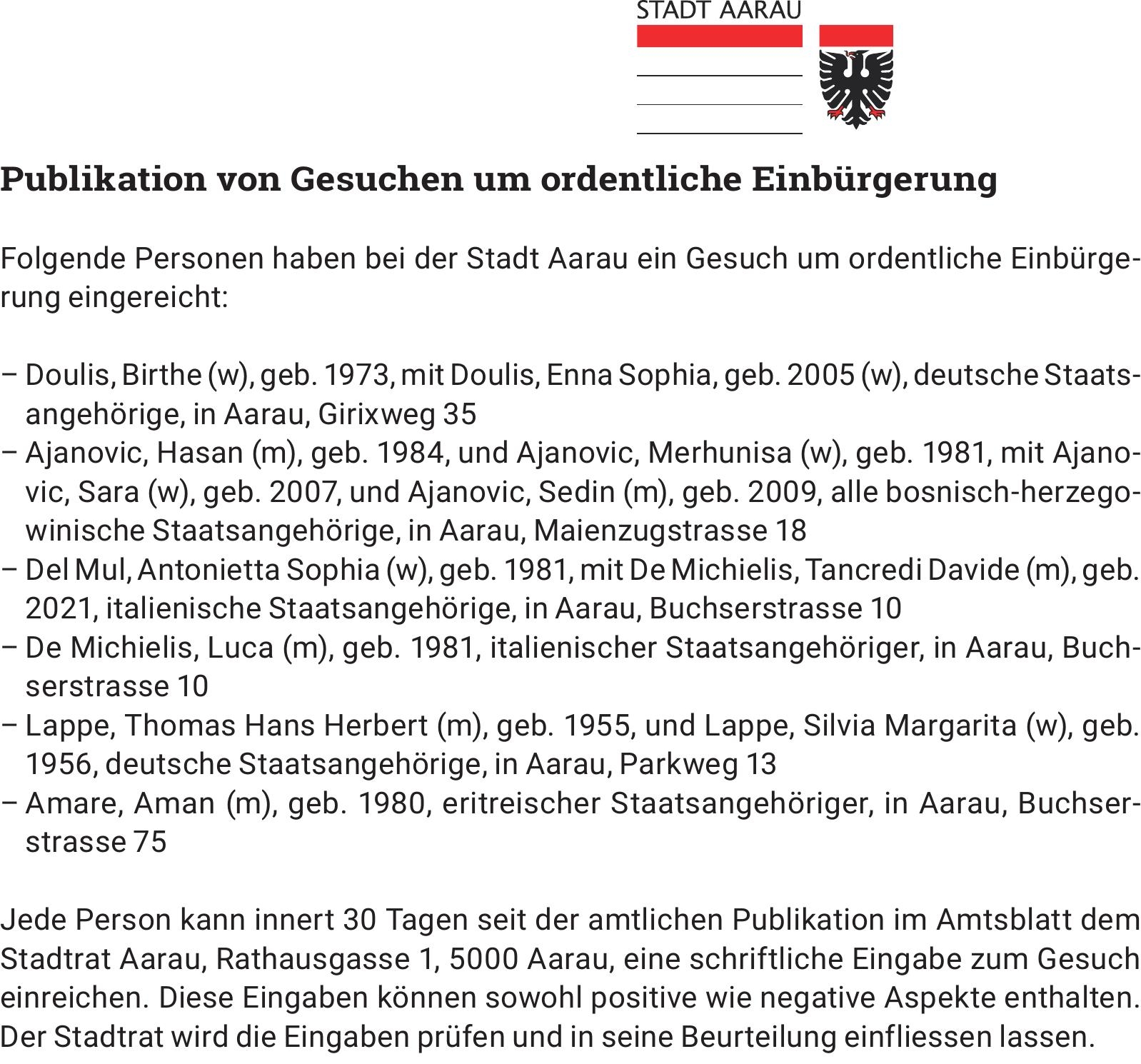 Publikation von Gesuchen um ordentliche Einbürgerung