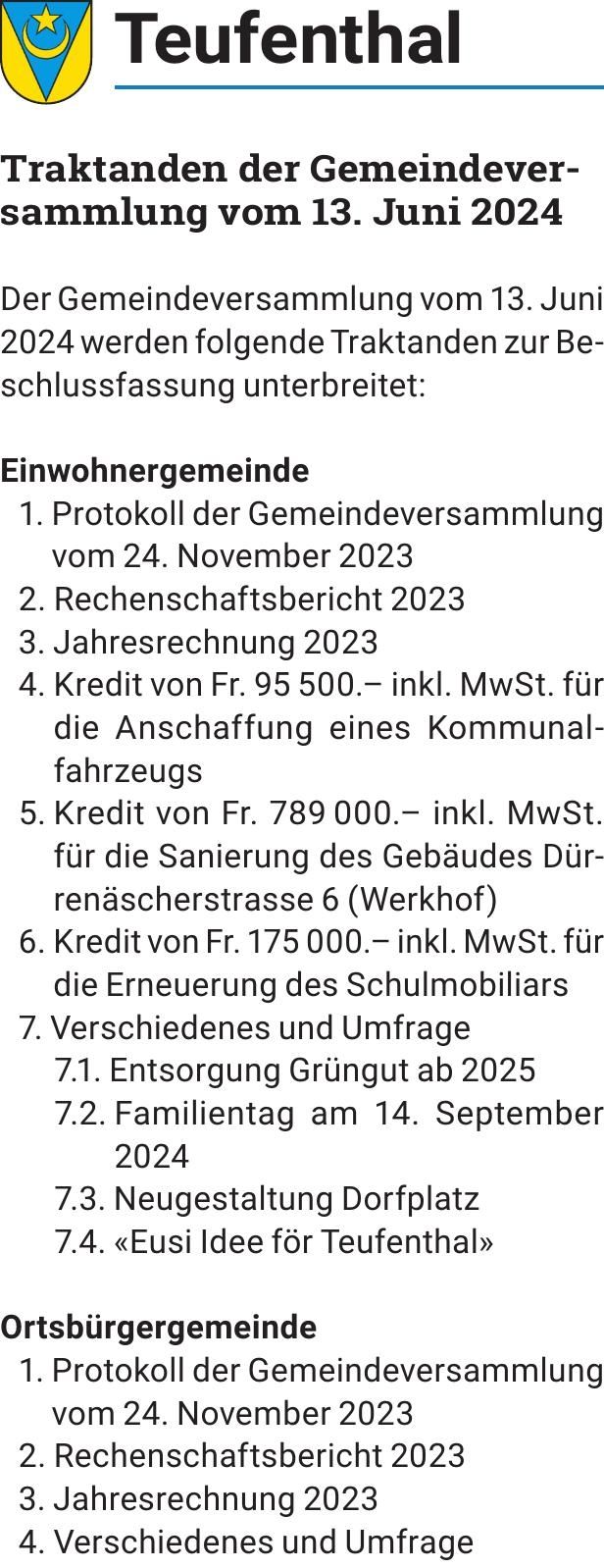 Traktanden der Gemeindeversammlung vom 13. Juni 2024