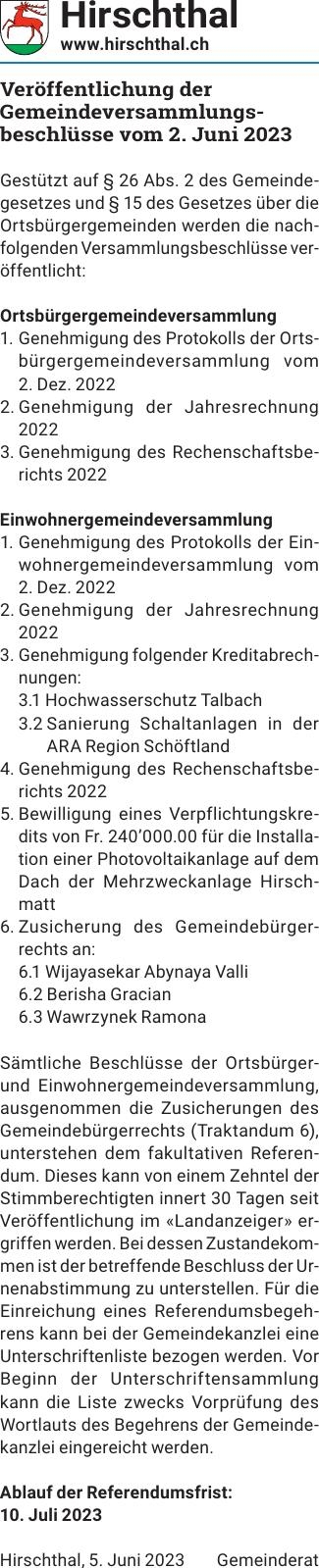 Veröffentlichung der Gemeindeversammlungsbeschlüsse vom 2. Jun