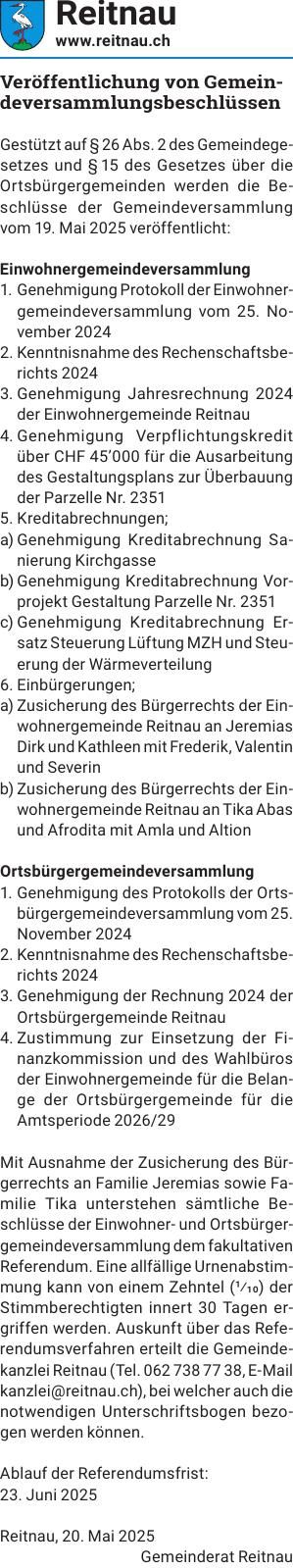 Veröffentlichung von Gemeindeversammlungsbeschlüssen