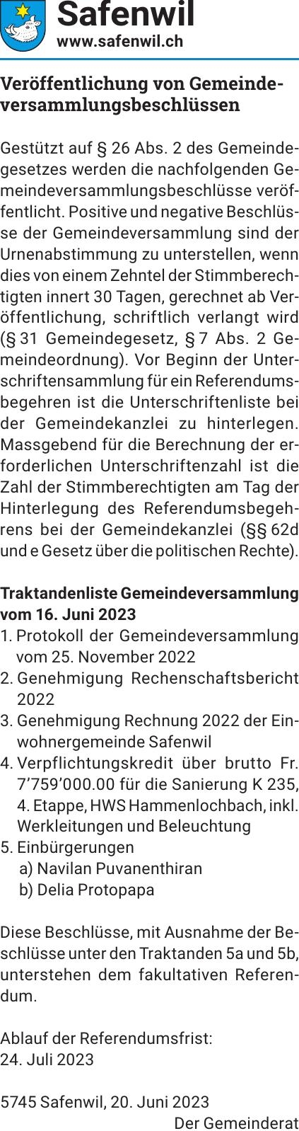 Veröffentlichung von Gemeindeversammlungsbeschlüssen